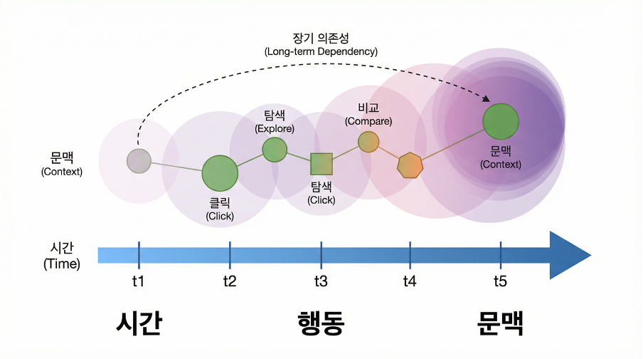 문맥은 시퀀스를 단순한 나열이 아닌 의미 구조로 만드는 핵심 요소입니다. 같은 행동이라도 문맥에 따라 전혀 다른 의미를 가집니다. 처음 보는 상품을 클릭하는 행동과 이미 여러 번 본 상품을 다시 클릭하는 행동은 이벤트 수준에서는 동일해 보이지만, 문맥이 다르기 때문에 해석은 완전히 달라집니다.