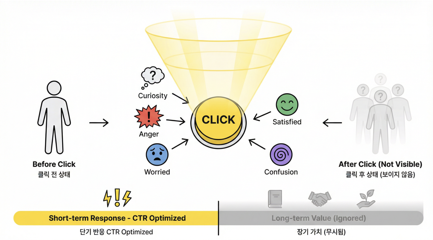 이 구조에서 추천의 목적은 사용자가 지금 이 순간 클릭할 가능성이 가장 높은 것을 고르는 일이 됩니다. 클릭이 왜 발생했는지, 클릭 이후 사용자가 어떤 감정을 느꼈는지는 고려되지 않습니다. 호기심, 자극, 불편함, 분노로 인한 클릭도 모두 동일한 성공 신호로 처리됩니다.