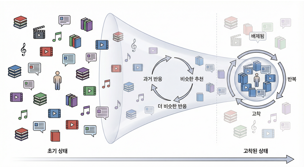 이번 내용에서 필터 버블은 부작용이 아니라 필연적인 결과로 설명됩니다. 추천 시스템은 과거 반응을 기준으로 선택지를 좁혀 갑니다. 반응이 있었던 콘텐츠는 더 자주 노출되고, 반응이 없었던 영역은 빠르게 사라집니다.