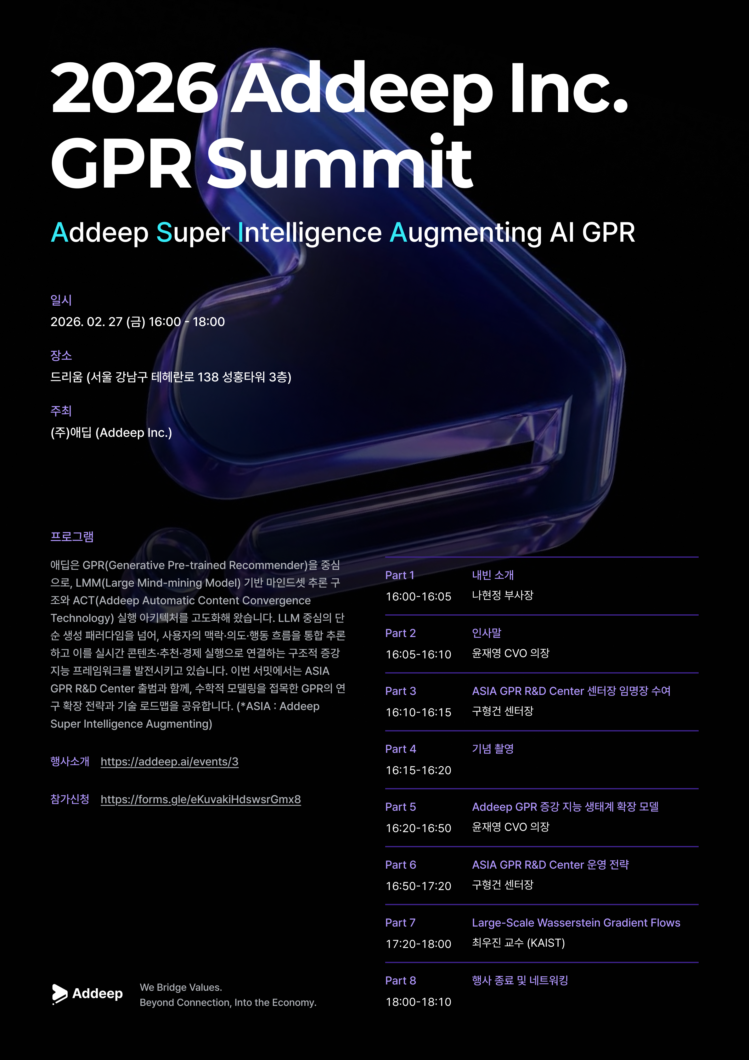 2026 Addeep Summit은 GPR 기술 비전을 공유하고 글로벌 연구 거점 출범을 공식화하며, 차세대 AI 수학적 모델을 함께 논의하는 통합의 장입니다. 애딥은 GPR을 중심으로 증강지능 인프라를 지속적으로 고도화하고, 연구와 산업을 잇는 생태계를 넓혀 나갈 방침입니다. AI의 다음 단계는 단순한 생성 경쟁을 넘어선 구조적 이해와 실행의 통합입니다. 서밋 현장에서 그 확고한 방향성을 직접 확인하시기 바랍니다.