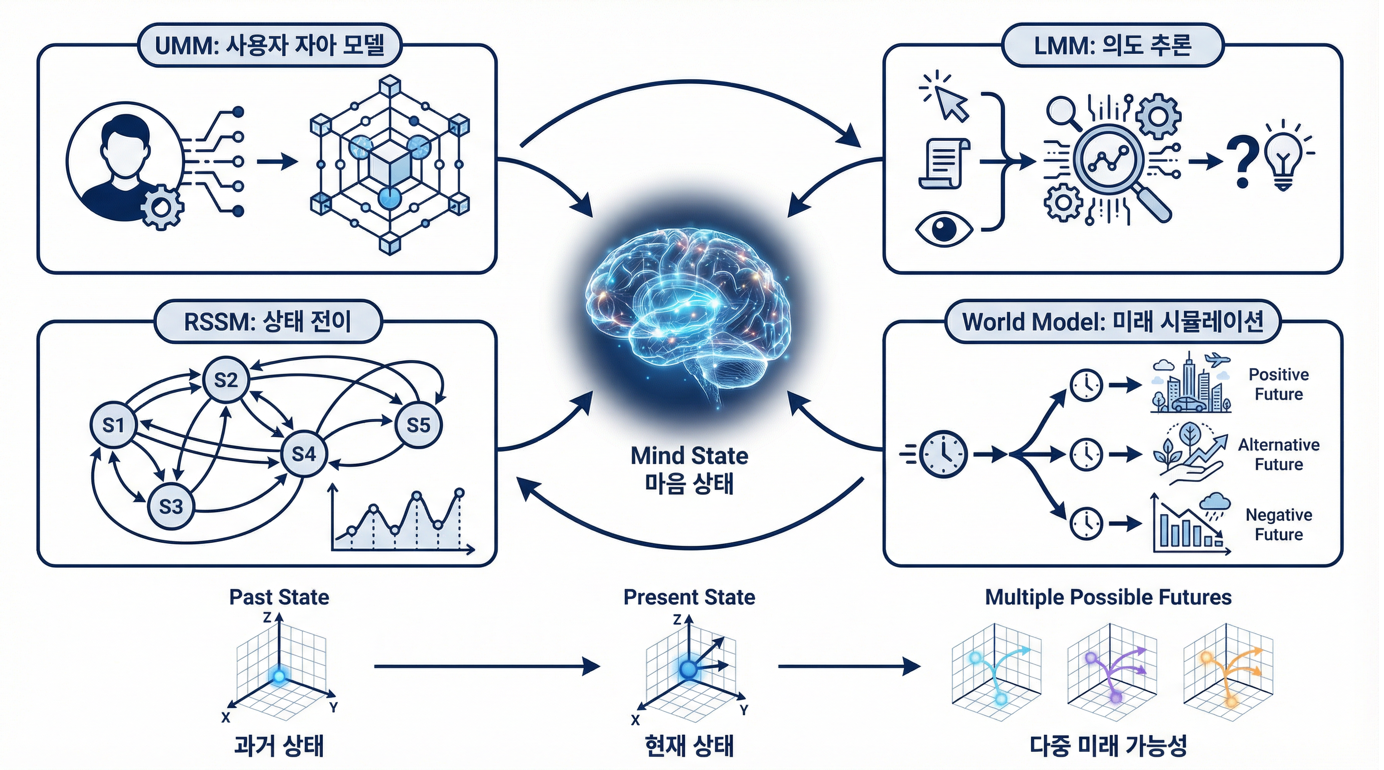 이 구조의 핵심은 어느 하나의 모델이 전부를 해결하지 않는다는 점입니다. 기억은 UMM이 담당하고, 해석은 LMM이 수행하며, 상태 갱신은 RSSM이 맡고, 미래 상상은 월드 모델이 담당합니다. 마인드셋 엔진은 이 네 축이 연결되면서 비로소 완성됩니다.