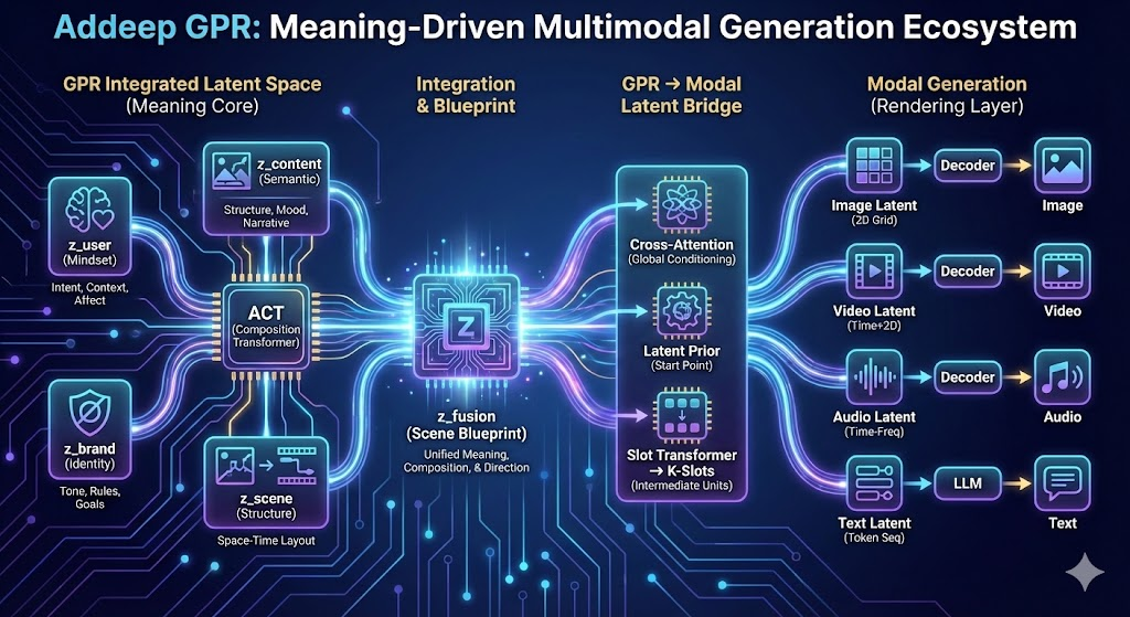 Addeep이 고도화 중인 GPR Integrated Latent Space는 사용자, 콘텐츠, 브랜드, 상품, 장면을 하나의 의미 기반 구조로 정렬하여 각 모달(이미지·영상·음원·텍스트) 생성 과정에 직접 반영하는 독자적 기술 체계입니다.